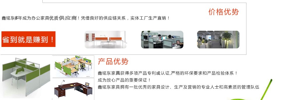 深圳市鑫銘東家具有限公司深圳市鑫銘東家具有限公司專業(yè)銷售各類辦公家具!產(chǎn)品涉及多種系列,如:班臺、班椅、屏風(fēng)、會議桌、會議椅、辦公沙發(fā)、茶幾、辦公桌、文件柜、電腦桌椅、各式餐臺、餐椅、書柜等辦公家具。 鑫銘東家具擁有一批優(yōu)秀的家具設(shè)計、生產(chǎn)及營銷的專業(yè)人士和高素質(zhì)的管理隊伍。銘東家具以"先難后易"之戰(zhàn)略,在產(chǎn)品結(jié)構(gòu)、產(chǎn)品質(zhì)量及服務(wù)水平方面,均推陳出新,力求完善,精益求精。使我們的產(chǎn)品質(zhì)量保持在國內(nèi)外家具潮流的先進(jìn)水平,力求滿足客戶的特殊需求。鑫銘東家具多年來致力于環(huán)保、實用家具的設(shè)計與開發(fā),集生產(chǎn)、銷售、服務(wù)于一體。本著"以人為本"的設(shè)計理念,大量開發(fā)符合人體工程學(xué)的各種產(chǎn)品,以"誠信為本"的質(zhì)量方針,真材實料,認(rèn)認(rèn)真真做產(chǎn)品,實實在在做人。鑫銘東家具更致力于創(chuàng)造"零維修率"的制造境界,實現(xiàn)"沒有維修的服務(wù)才是最好服務(wù)"的口號》了解更多 |